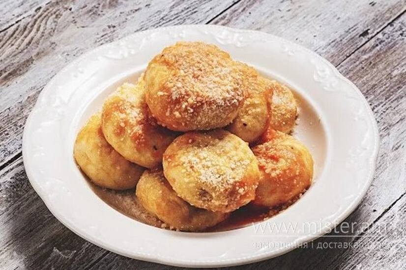 Парова галушка з м`ясом у томатному соусі з базиліком присипана пармезаном.