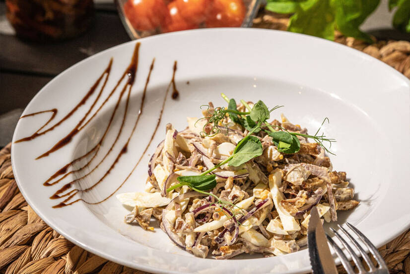 Язик телячий, шинка, куряче філе, помідор, цибуля, майонез.