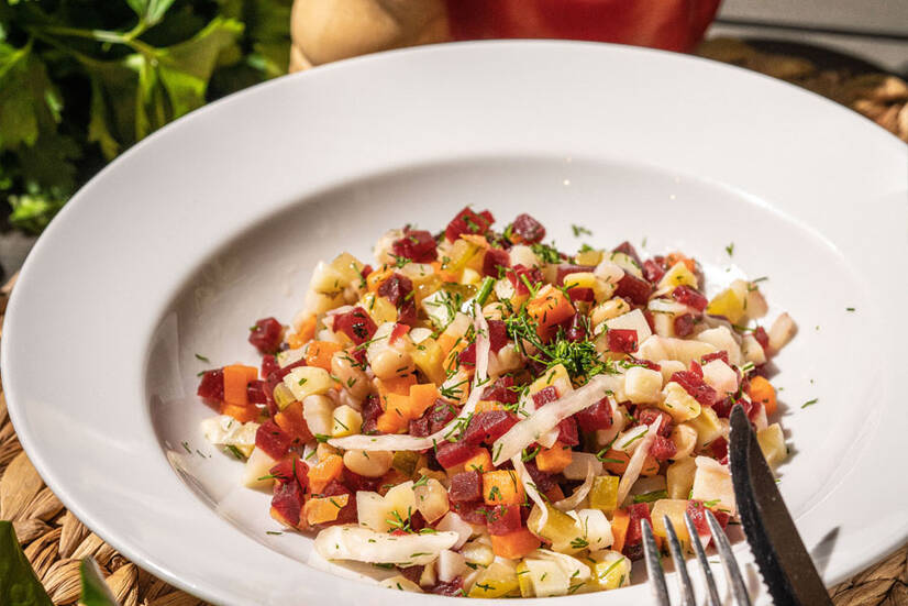 Картопля, буряк, морква, квашена капуста, квасоля, солоний огірок, рослинна олія