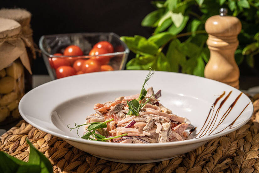 Язик, шинка, куряче філе, помідор, цибуля, майонез.
