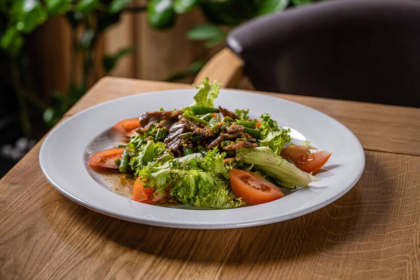 Свинина, лист салату, помідор, спаржева квасоля під гірчично-медовим соусом.