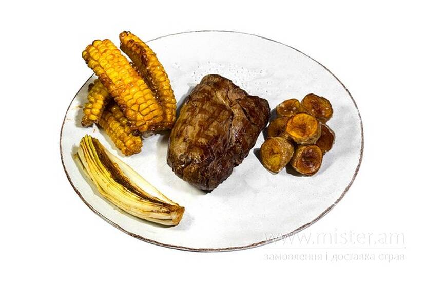 Соковитий стейк з бейбі картоплею, гриль цибулею порей та смаженою кукурудзою.