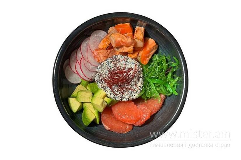 Лосось Татакі, кокосовий кіноа, авокадо, водорості чука, соковите філе грейпфрута, редис.