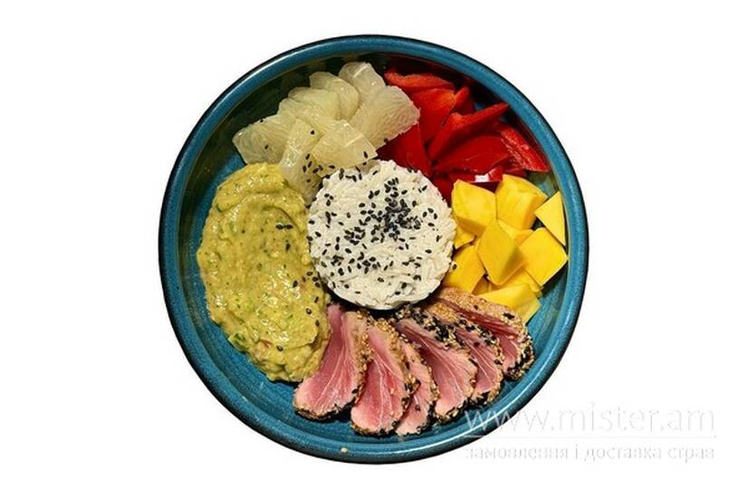 Тунець обсмажений в міксі кунжута, кокосовий рис на рибному бульйоні, авторський Гуакамоле, манго, помело, болгарський перець.