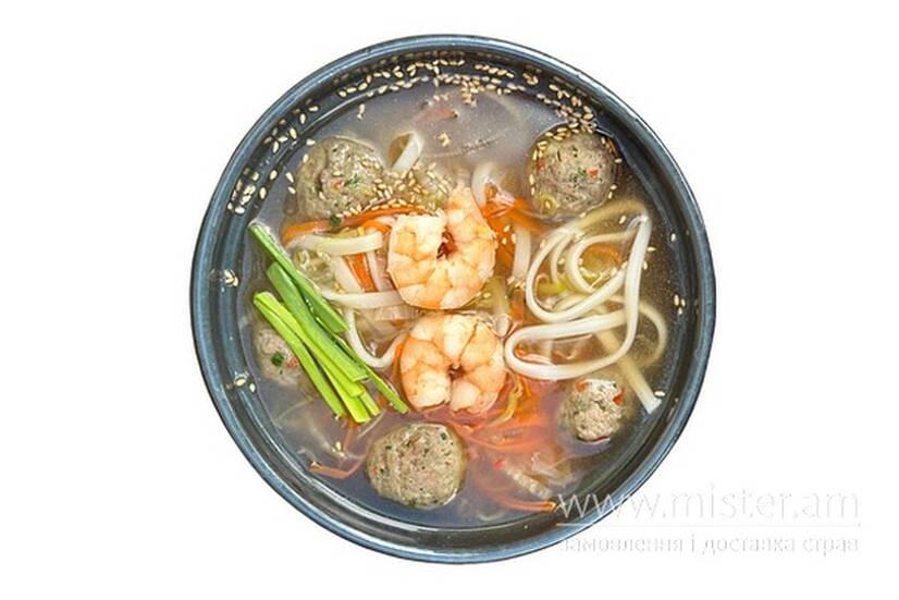 Традиційний японський суп сумоїстів на рибному бульйоні з телячими мітболами, креветками та овочами.