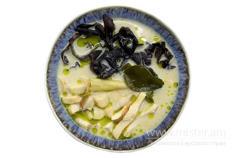 Традиційний в`єтнамський суп на рибному бульйоні з кокосовим молоком, деревними грибами, грибами Ерінг та пряною зеленню - каффір лайм, лемонграс, галангал.
