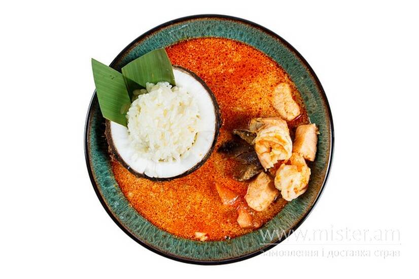 Кисло-гострий суп на рибному бульйоні з креветками, лососем, лемонграссом, шиитаке й кінзою. Подається з кокосовим рисом.