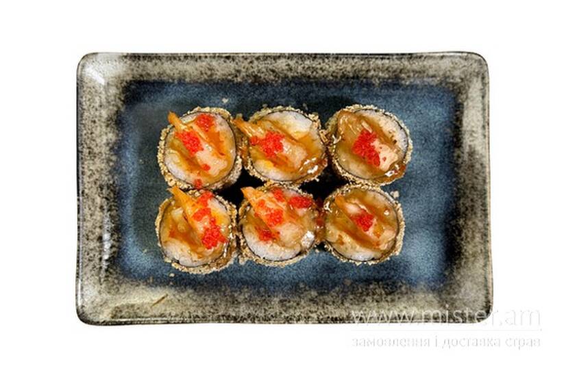 Креветка WOK з пряними соусами Шрірача та Світ Чілі, сніжний краб, вершковий сир, ікра летючої риби. Обсмажений в хрусткій та панко.