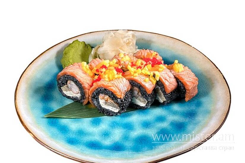 Смажений лосось у соусі Барбекю-гранат, креветка, томаго, вершковий сир, тартар із манго та ікра тобіко.