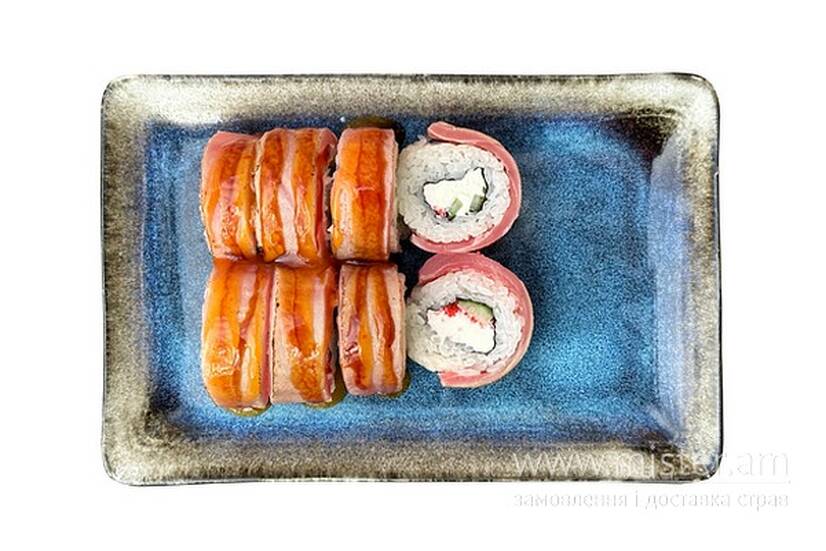 Смажений тунець в соусах Манго-Юдзу та Унагі, вершковий сир, огірок та ікра тобіко.