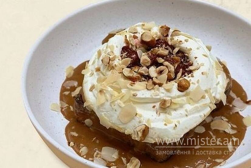 Булка бріош в яєчній глазурі, соус з іриски, соус з вишні, крем філадельфія, мигдалеві пластівці, карамелізовані горіхи (мигдаль, фундук).
