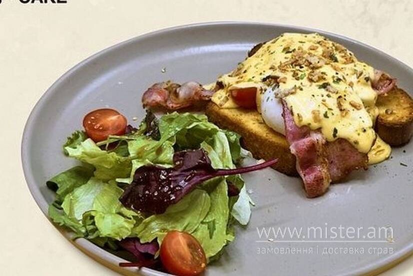 Яйця пашот (2 шт.), смажений бекон, булка бріош, мікс салата, помідори чері, соус Чеддер, цибуля кранч.