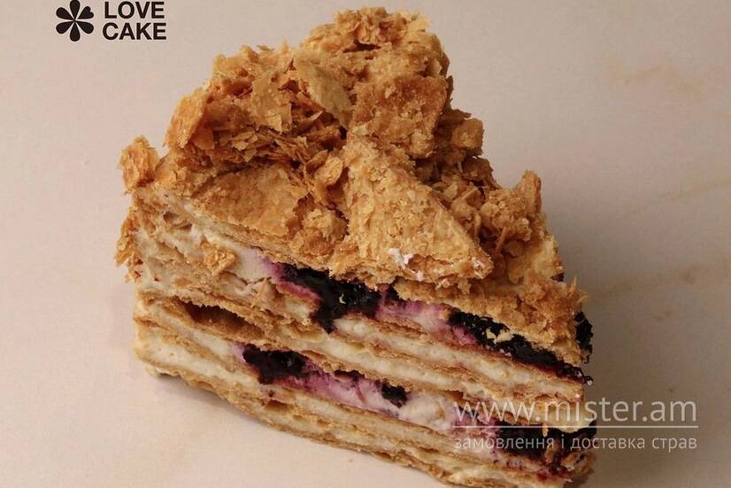 Хрусткі коржі з рурбленого тіста , вершково-заварним кремом та чорничним конфі.
