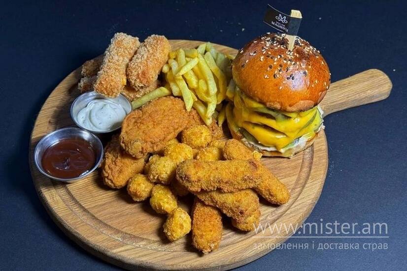 Бургер з потрійною котлетою, картопля фрі, сирні палички, телячі палички, курячий попкорн, курячі крильця кріспі, соус барбекю, соус тар-тар.