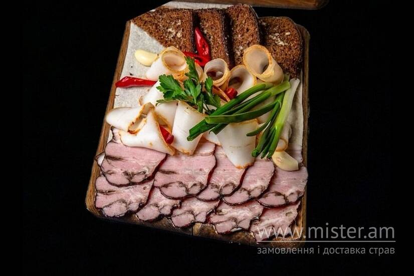 Бекон, сало, огірки, грінки, чилі, цибуля зелена.