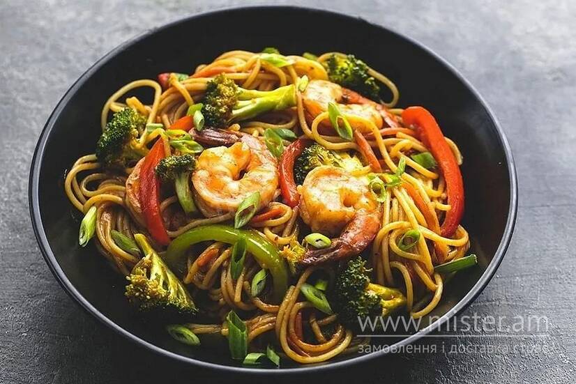 Локшина удон, креветки, яйце куряче, норі, вакаме, перець болгарський, морква, спаржа, броколі, цибуля порей.