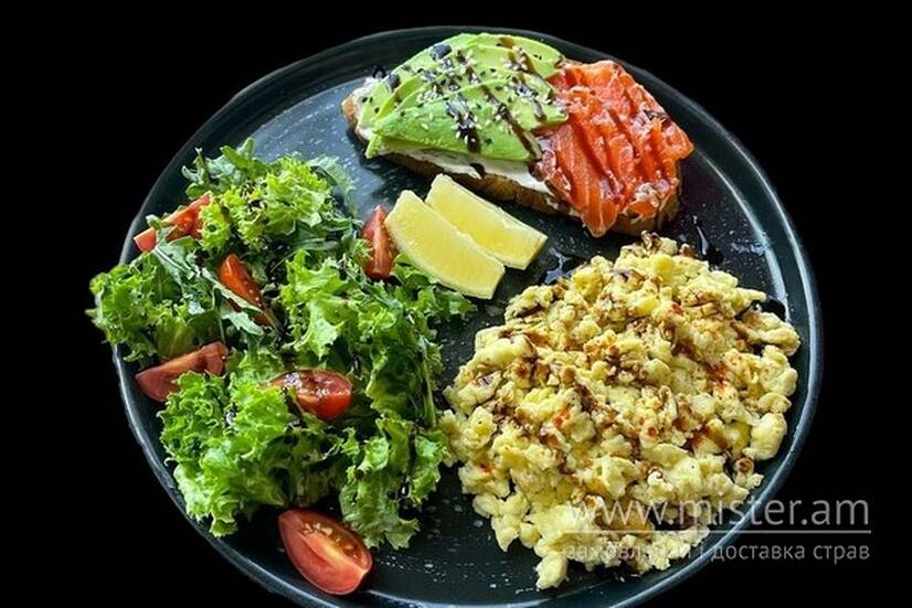 Сніданок зі скремблом, лососем і авокадо