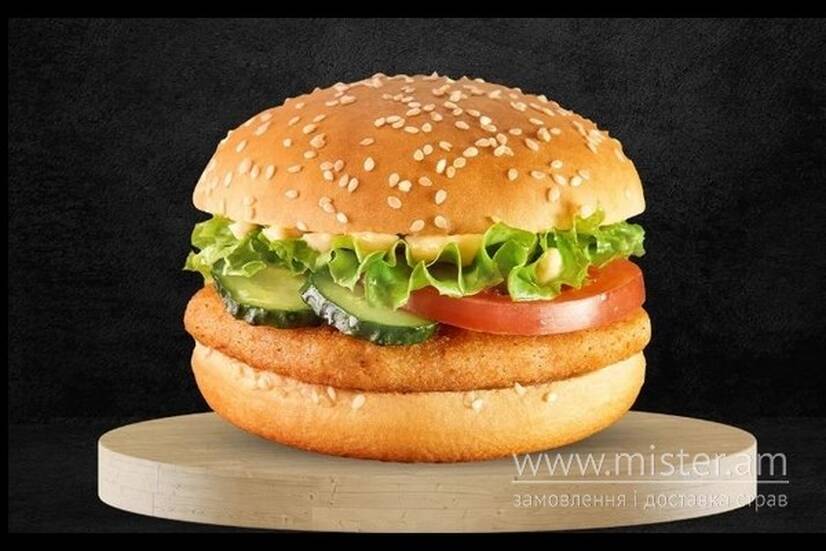 Булочка для бургера, котлета куряча, мікс салатів, помідор свіжий, огірок свіжий, сир, соус Цезар.