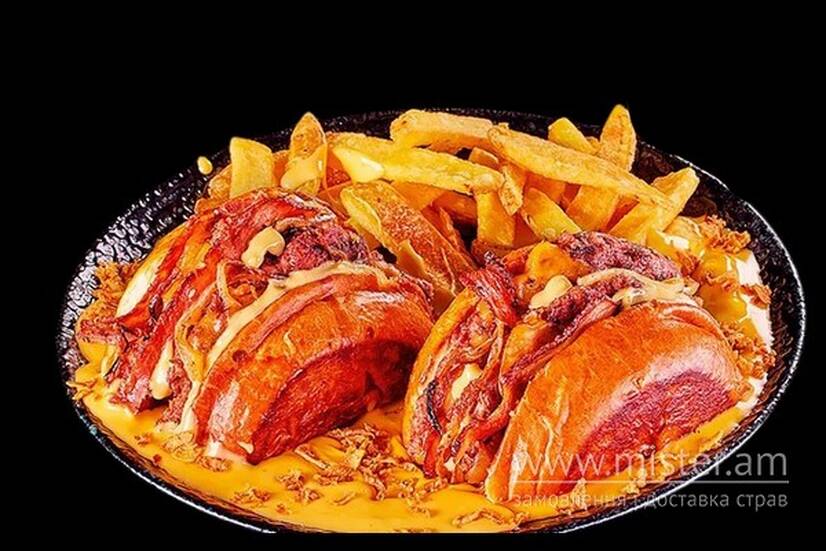 Подвійна котлета з телятини, бекон, мікс салатів, помідор, цибуля,сир, соус сирний, соус медово-гірчичний, соус вершковий.