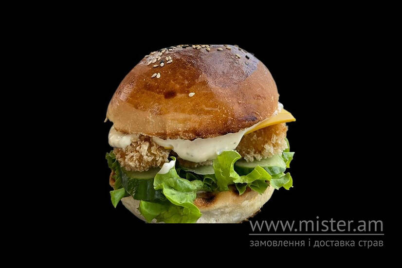 Риба в паніровці, огірок свіжий, соус тартар, сир чедер, листя салату.
