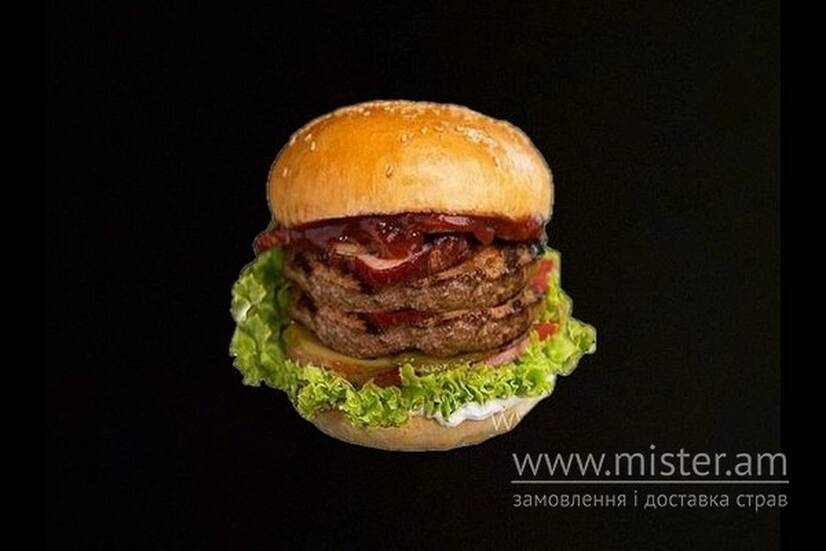 Подвійна котлета зі свинини, помідор, сир чедер, слайси бекону, маринована цибуля, соус гаваї, листя салату.