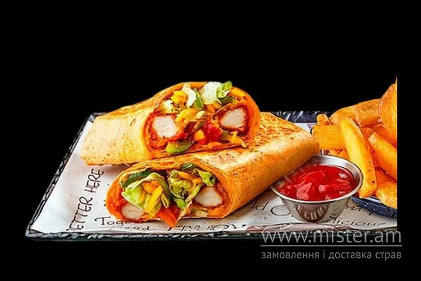 Лаваш, куряче філе, морква, капуста, огірок свіжий, помідор свіжий,соус цезар, сир чедер.