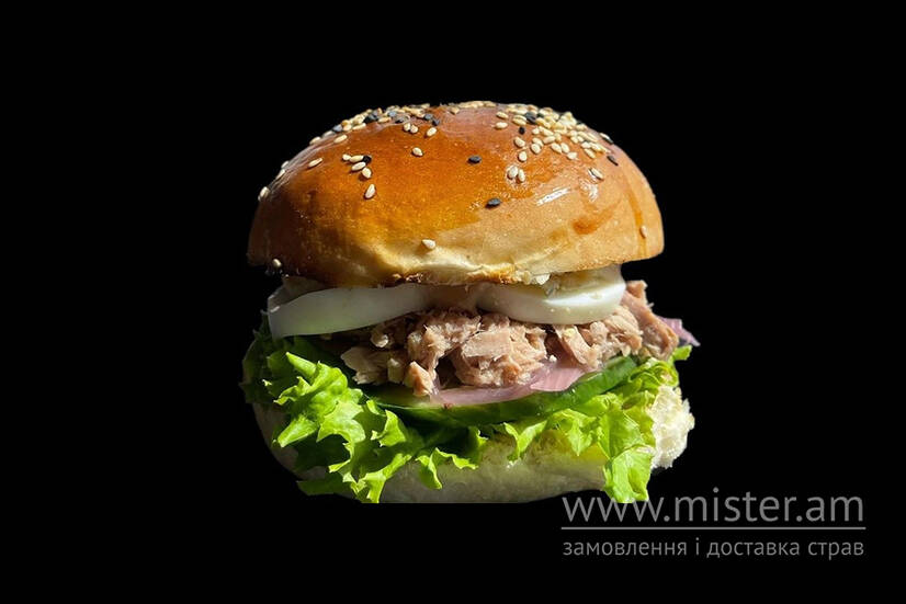 Тунець консервований, соус цезар, огірок свіжий, яйця варені, цибуля маринована, листя салату.
