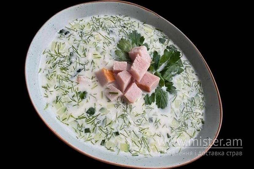 Картопля, яйце, куряче філе свіже, шинка, огірок свіжий, зелень, заправка.