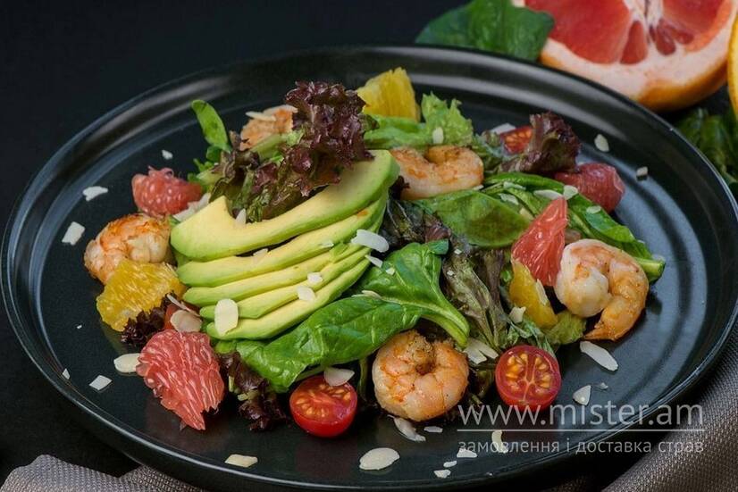 Мікс салатів, рукола, помідор, апельсин, грейпфрут, креветки, авокадо, мигдалеві пелюстки.