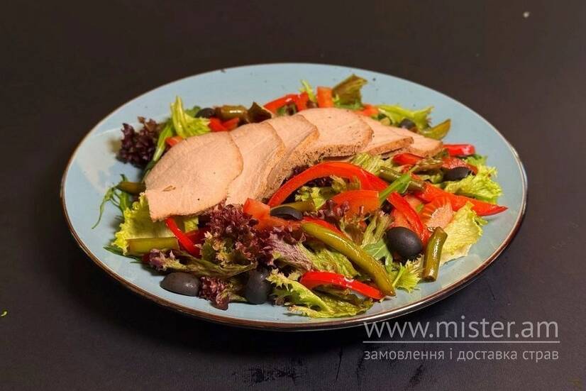 Мікс салатів, свинина, маслини, перець болгарський, квасоля стручкова, помідор, соус гірчично-медовий.