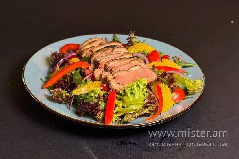 Мікс салату, перець, помідори, цибуля синя, качина грудка апельсин, соус медово-гірчичний, соус бальзамік.