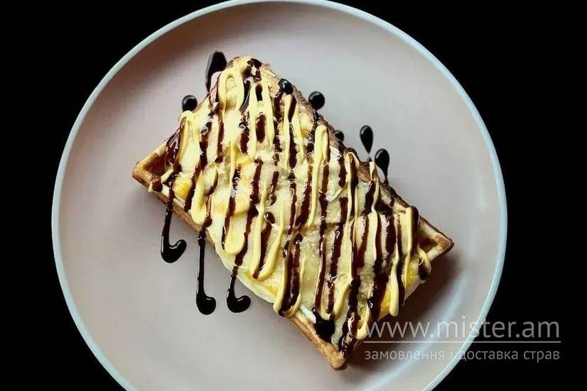 Вафля, сир моцарела, сир лазур, сир камамбер, сир пармезан, груша, соус бальзамічний, зелень.