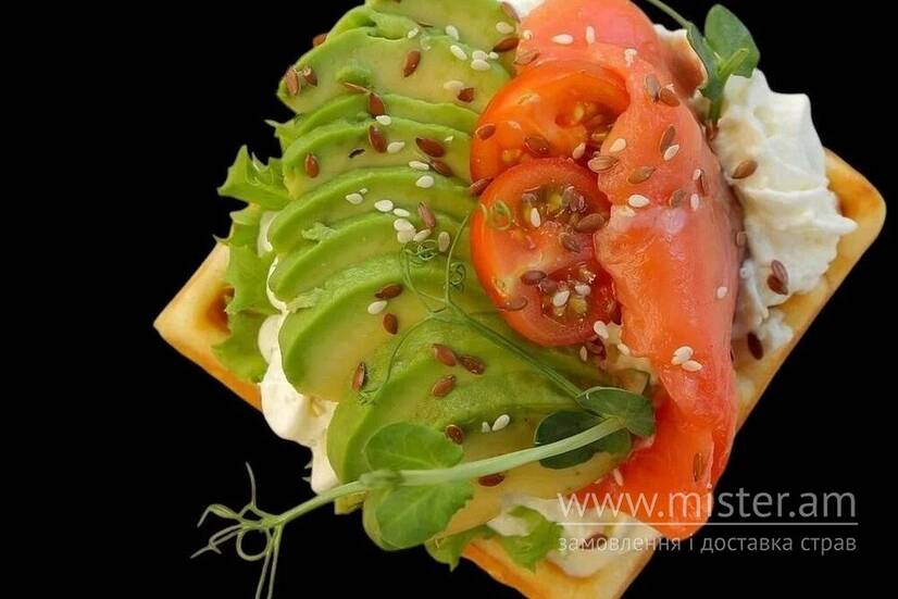Вафля, лосось, авокадо, сирний соус, зелень.