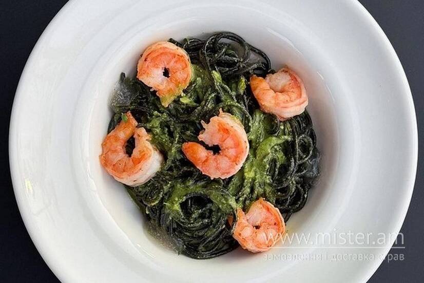 Паста чорна, тигрова креветка, вершки, пармезан, зелень.