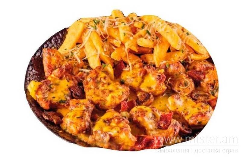 Свинина, бекон, гриби, цибуля, картопляні діпи, пармезан, сирний соус.
