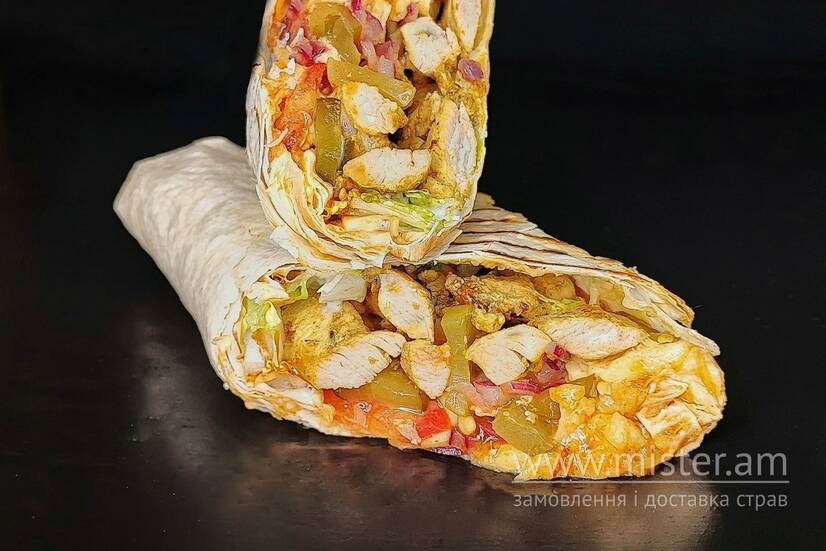 Лаваш, пекінська капуста, курка 2х, соус фірмовий, соус барбекю, огірок малосолений, томати, цибуля марс, сир.