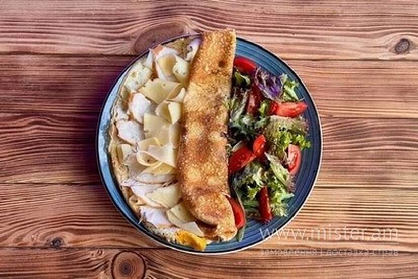Омлет, курка в/к, сир Швейцарський, мікс салату.