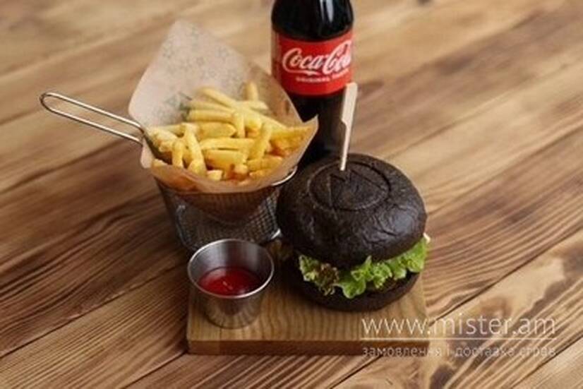 Бургер "Монтана" свинина, фрі стандарт, кетчуп, напій на вибір.
