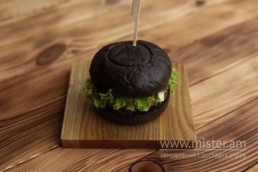 Чорна булочка власної випічки, котлета зі свинини, огірок маринований, часникова паста, сир Моцарела, сир Чеддер, лист салату, соус "Барбекю".