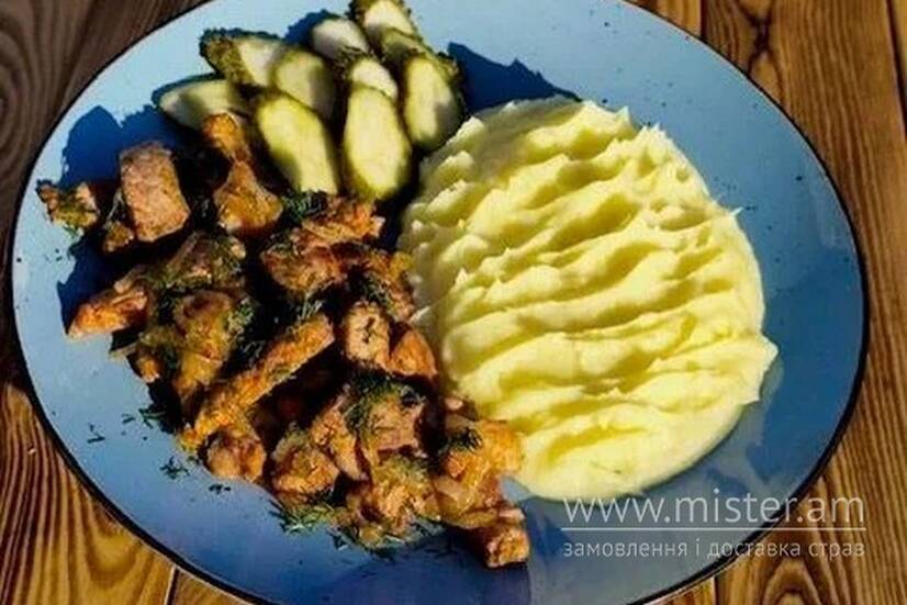 Свинина маринована, цибуля ріпчаста, картопляне пюре, зелень, огірок корнішон маринований.