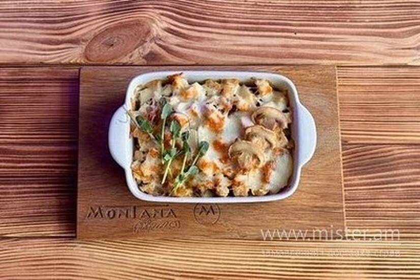 Картопля, куряче філе, соус жульєн, запечені під соусом та сиром з часниковим маслом.