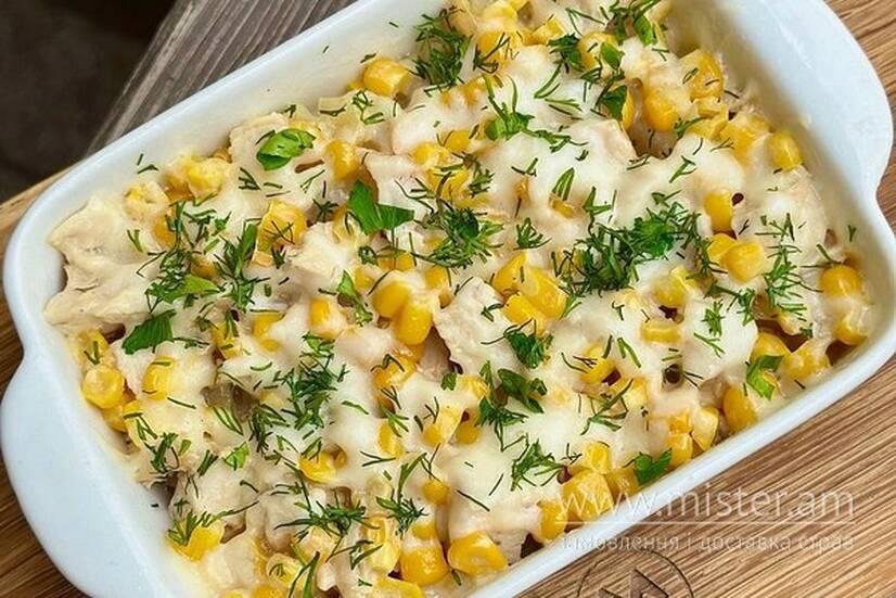 Картопля, куряче філе, кукурудза, соус "Бешамель", запечені під соусом та сиром з ароматним часниковим маслом.