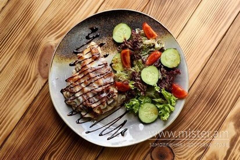 Куряче філе, печериці, цибуля, сир моцарелла, салат, кунжут.