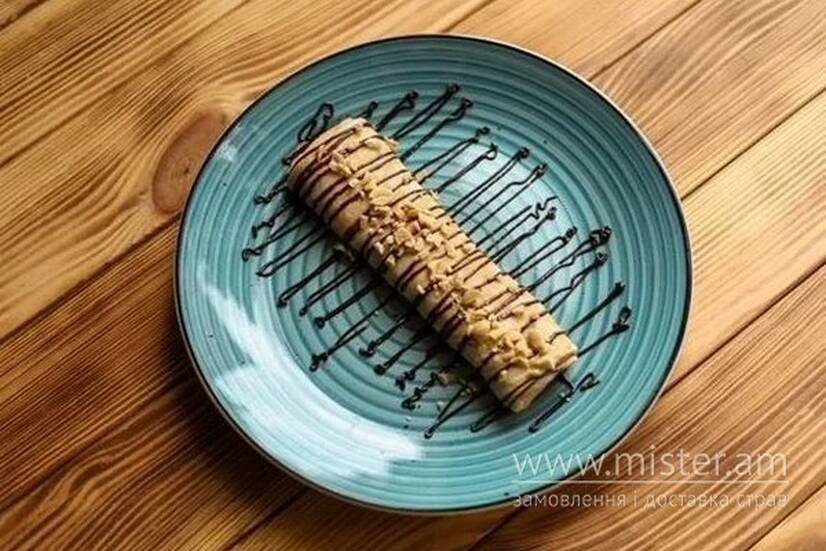 Млинець солодкий, топінг солона карамель, топінг шоколадний, арахіс.