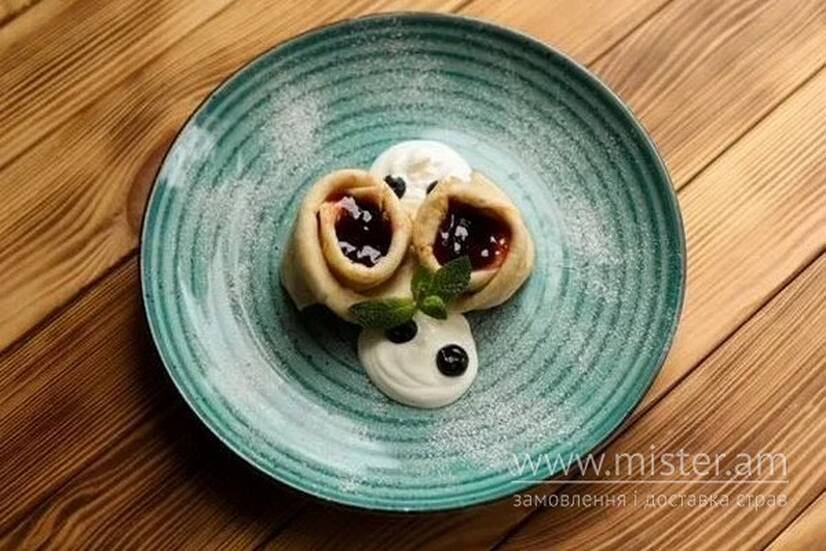 Млинець солодкий, джем ягідний, сметана, цукрова пудра, мята, сезонна ягода.