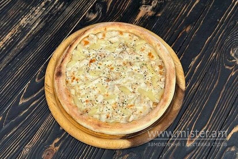Томатний соус, моцарела, куряче філе, ананаси, італійські трави.