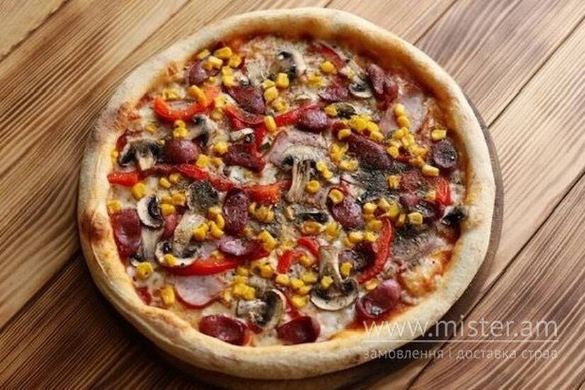 Томатний соус, моцарела, мисливські ковбаски, печериці свіжі, балик, перець болгарський, кукурудза, італійські трави.