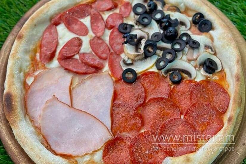 Томатний соус, соус "Бешамель", моцарела, мисливські колбаски, грудка куряча в/к, салямі пепероні, печериці свіжі, маслини.