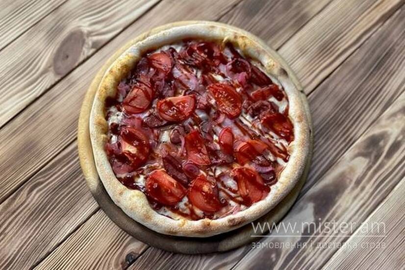 Томатний соус, моцарела, бекон, мисливські колбаски, помідор, цибуля маринована, соус Барбекю.