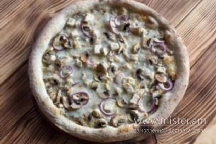 Соус червоний, сир моцарела, куряче філе, цибуля синя, гриби свіжі, сир пармезан, соус грибний.